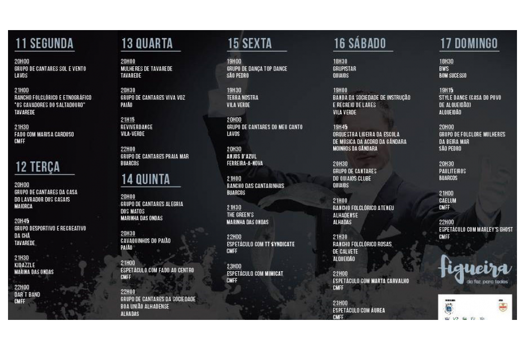 Feijoada de sames (S. Pedro), raia enxambrada (Buarcos e S. Julião), bolos de sangue (Paião), arroz de cabidela (Moinhos da Gândara), chouriço assado de Quiaios (Quiaios), polvo com arroz (Tavarede), esturros (Marinha das Ondas), fritada à moda das Alhadas (Alhadas), papas de moado (Vila Verde), sopa gandaresa (Bom Sucesso), sarrabulho à gandaresa (Ferreira-a-Nova), sopa do Duque (Lavos), arroz doce (Maiorca) e bacalhau assado (Alqueidão) são algumas das iguarias que poderão ser saboreadas.