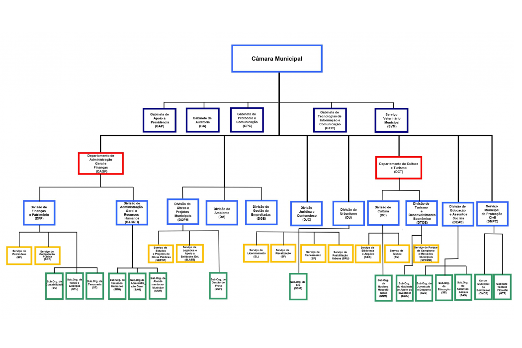 A actual estrutura orgânica é composta pelos Departamentos de Administração Geral e Finanças e Departamento de Cultura e Turismo (dirigidos respectivamente por Vítor Pereira e Margarida Perrolas) e pelas divisões de Finanças e Património; Administração Geral e Recursos Humanos; Obras e Projectos Municipais; Ambiente; Gestão de Empreitadas; Jurídica e Contencioso; Urbanismo; Cultura; Turismo e Desenvolvimento Económico; Educação e Assuntos Sociais; e ainda Serviço Municipal de Protecção Civil.